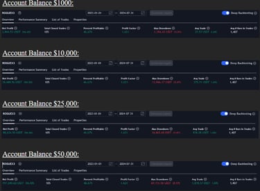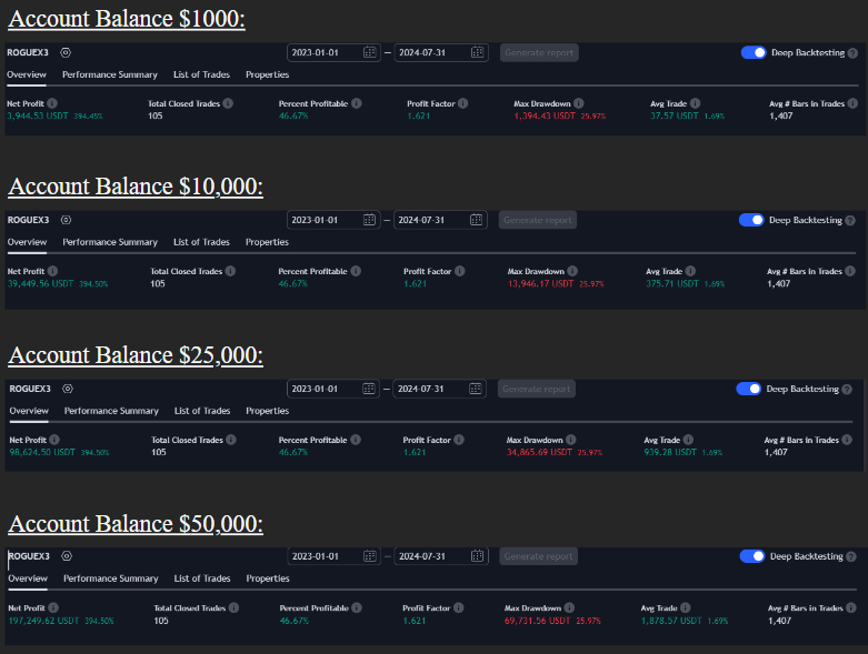 The images above illustrate the performance of the ROGUEX3 algorithm from January 1, 2023, to the present, utilizing TradingView's certified backtesting data. Each image demonstrates performance based on initial account values of $1,000, $5,000, and $10,000, with no additional funds contributed. Key highlights include: